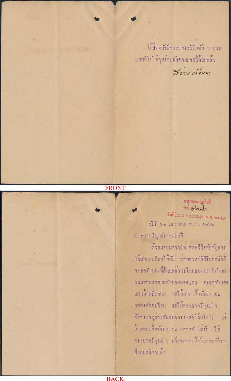 Royal Letter - 1927 on half fold paper size 12.5x20 cm. to Phaya Boriboon Rachsombat dated 20 January B.E. 2470 augtographed by H.M. Queen Sawang Wattana. Content printed by typewriter related to land mortage. On top left corner embossed colourless H.M.'s emblem and right top rubberstamped in 3 lines of Department of the Privy Purse in red with received number and date in manuscript. Excellent condition. VF.(1)